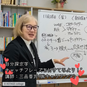 こんにちは。ASTAGEカレッジの寺村です。本日は、11月28日(火)に開催した自分探求学『キャッチフレーズを付けてみよう!』をご紹介します。 このプログラムには、コピーライターとして企業広告などを手掛ける『三品香さん( […]