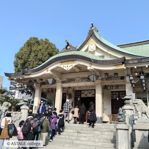 難波の繁華街を離れ南西に10分ほど歩いた所にあるこの神社は、厄除け・疫病退散・縁結び・安産などにご利益があるといわれています。