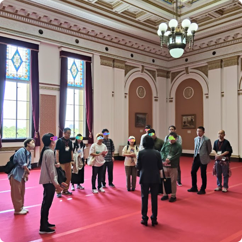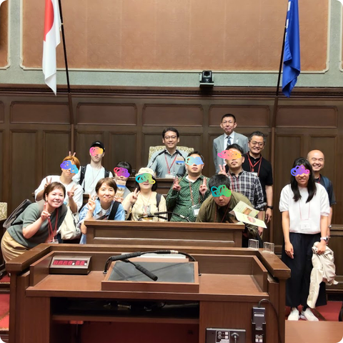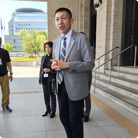次に訪れたのは「大阪府議会議場」です。この日は議会はなく、議場に直接入って説明を受けることが出来ました。府知事席や議長席など実際の議員席・理事席に座る体験などもOKで、みんな大人げなく大はしゃぎ(笑)見学を終えて、玄関ホールの大階段を降りようとすると、偶然にも吉村洋文府知事が当庁されるタイミングにドンピシャリ‼杉江さんの計らいで一緒に記念撮影をしてもらいました。