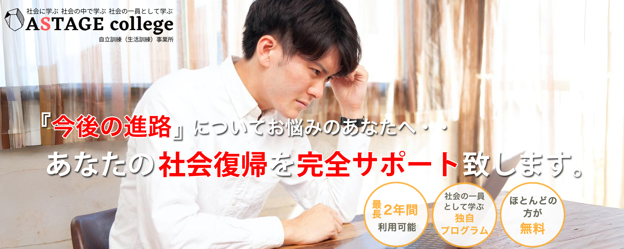 自立訓練事業所 ASTAGE College(アステージカレッジ)は、社会に出た時に一生役立つ、本質を追求したプログラムによって、一人一人それぞれのカタチにあった社会参加を実現して頂くためのスキームをご用意しています。